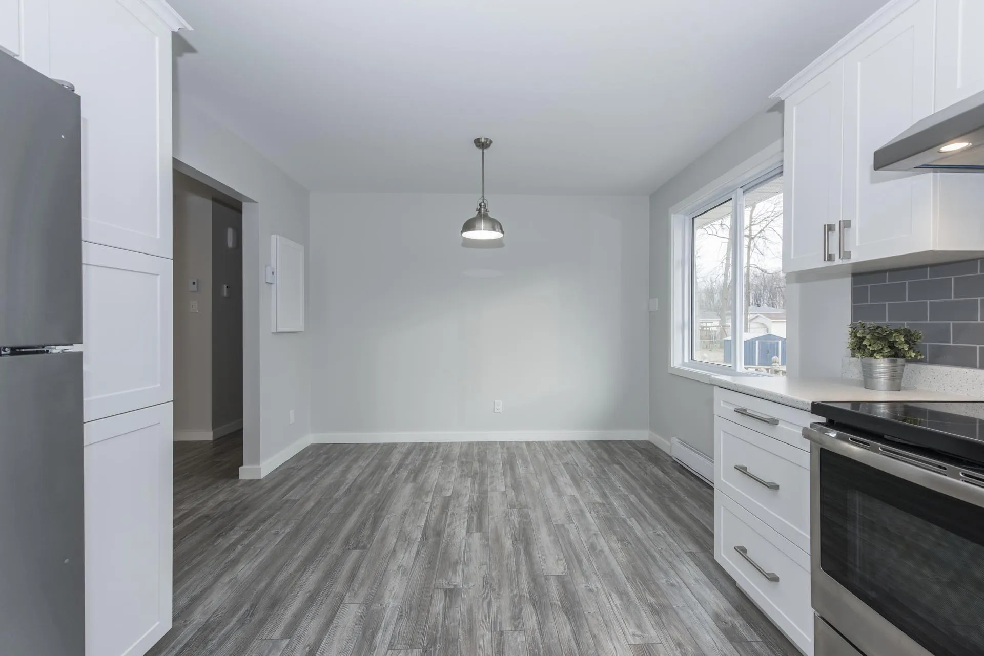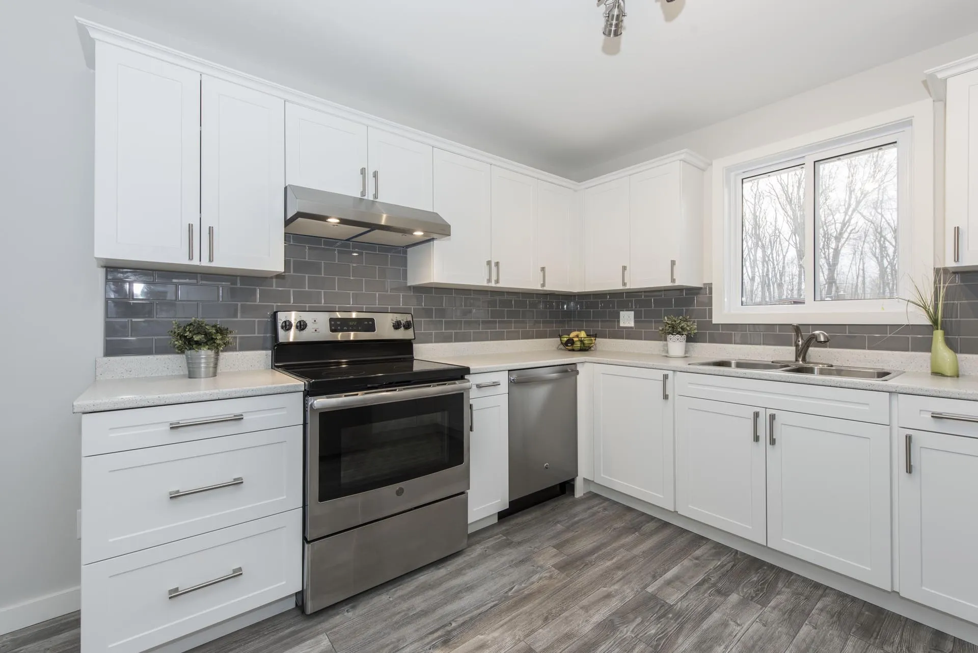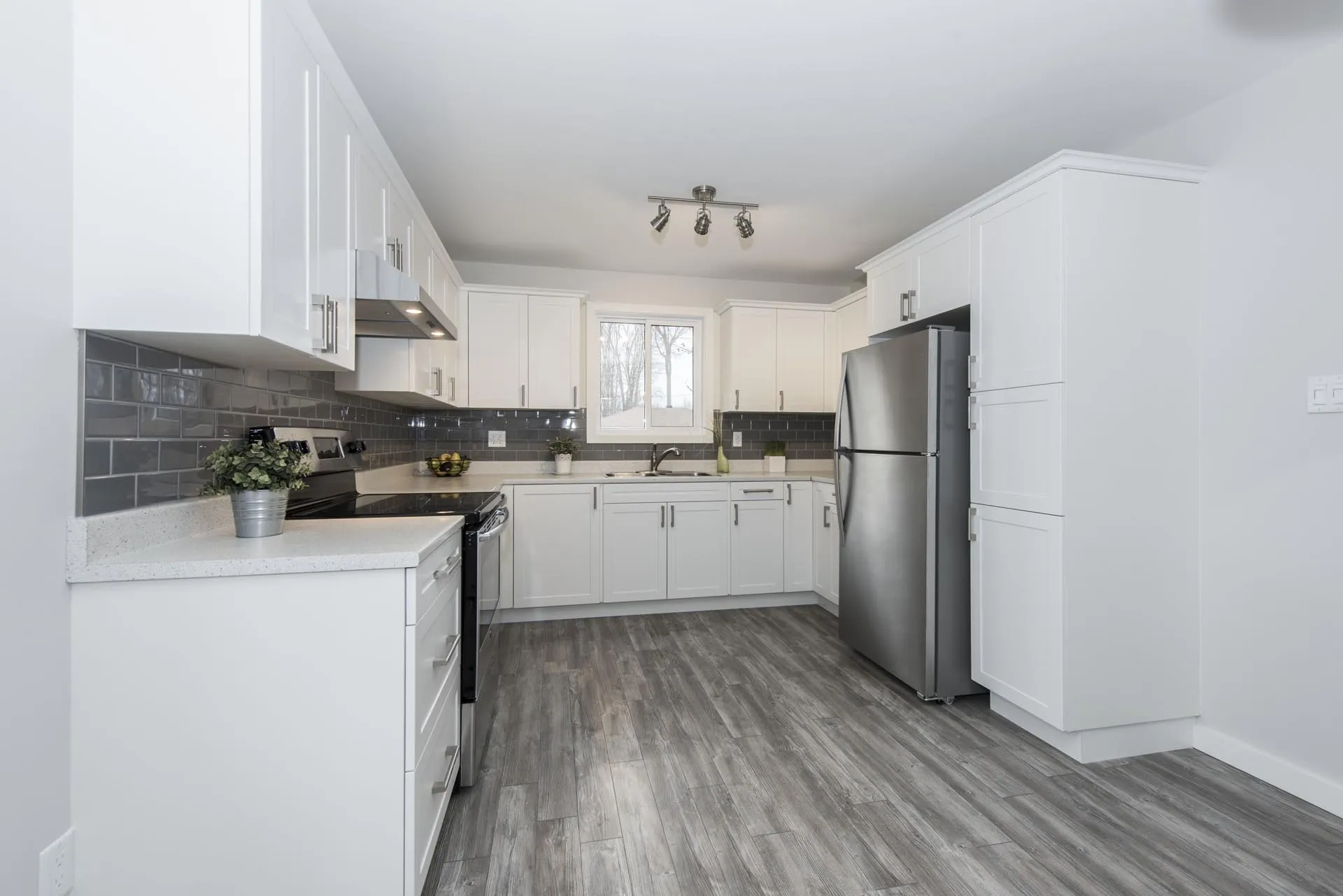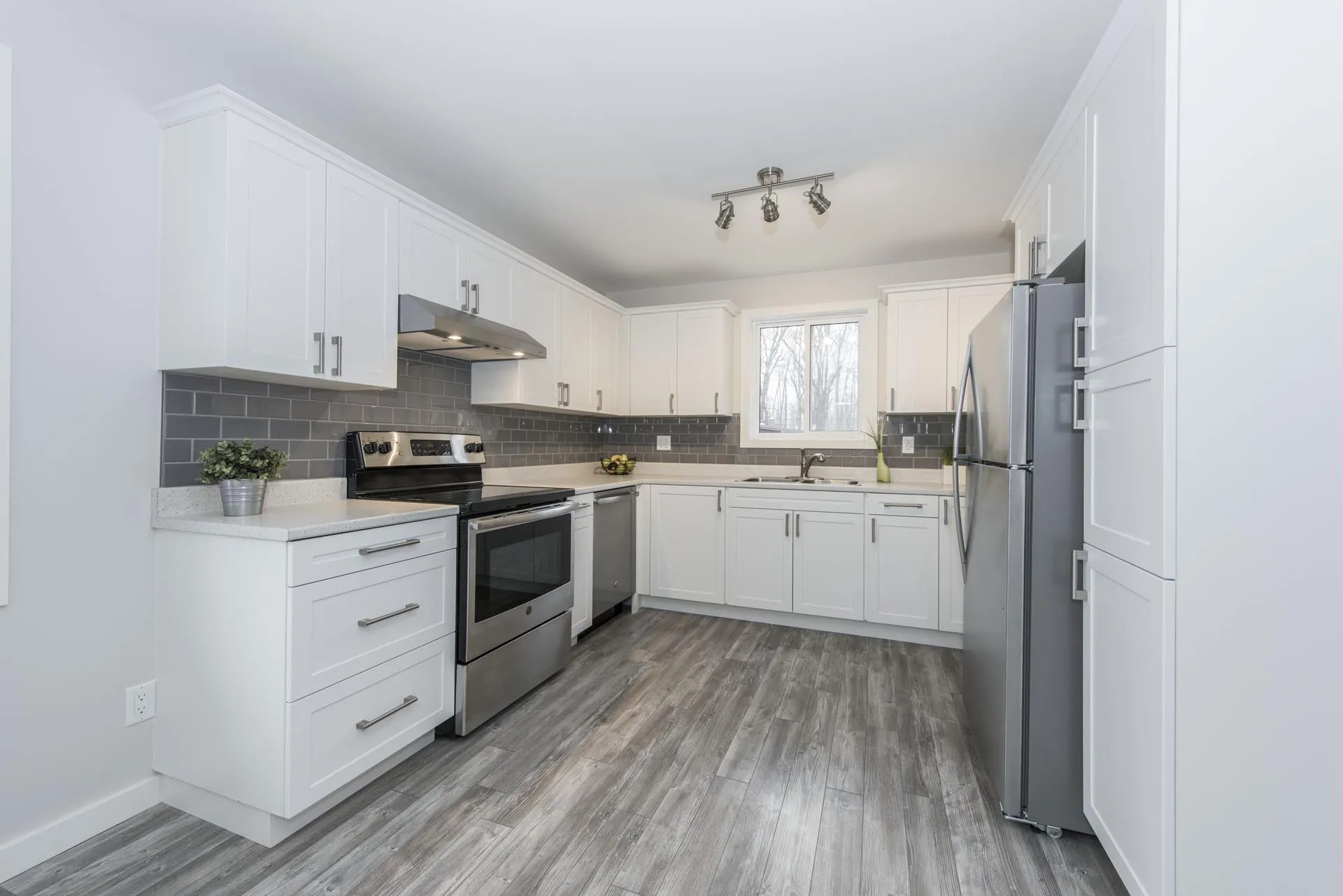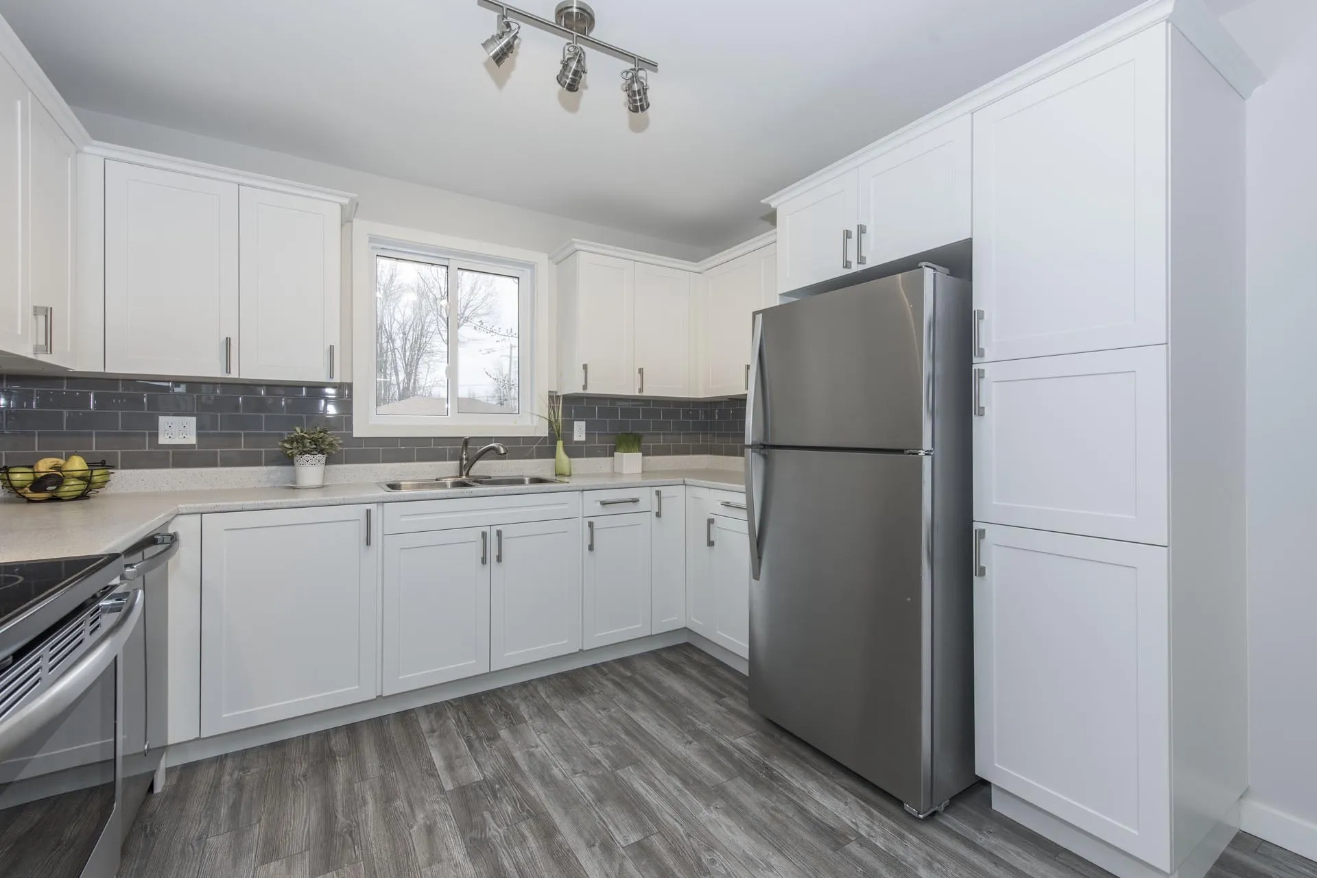 This kitchen is part of our ‘Glenview Heights Basement Apartment Conversion and Whole House Renovation’. It is the kitchen designed for the 2 bedroom basement apartment unit in this duplex conversion. It boasts stainless steel appliances, two tone modern cabinetry, stacked ceramic tile backsplash, and laminate flooring.
