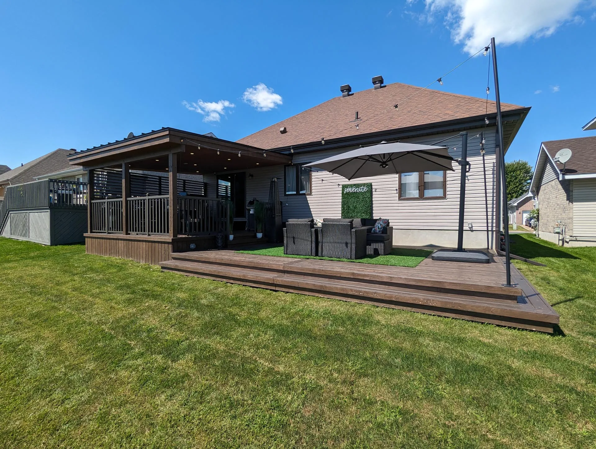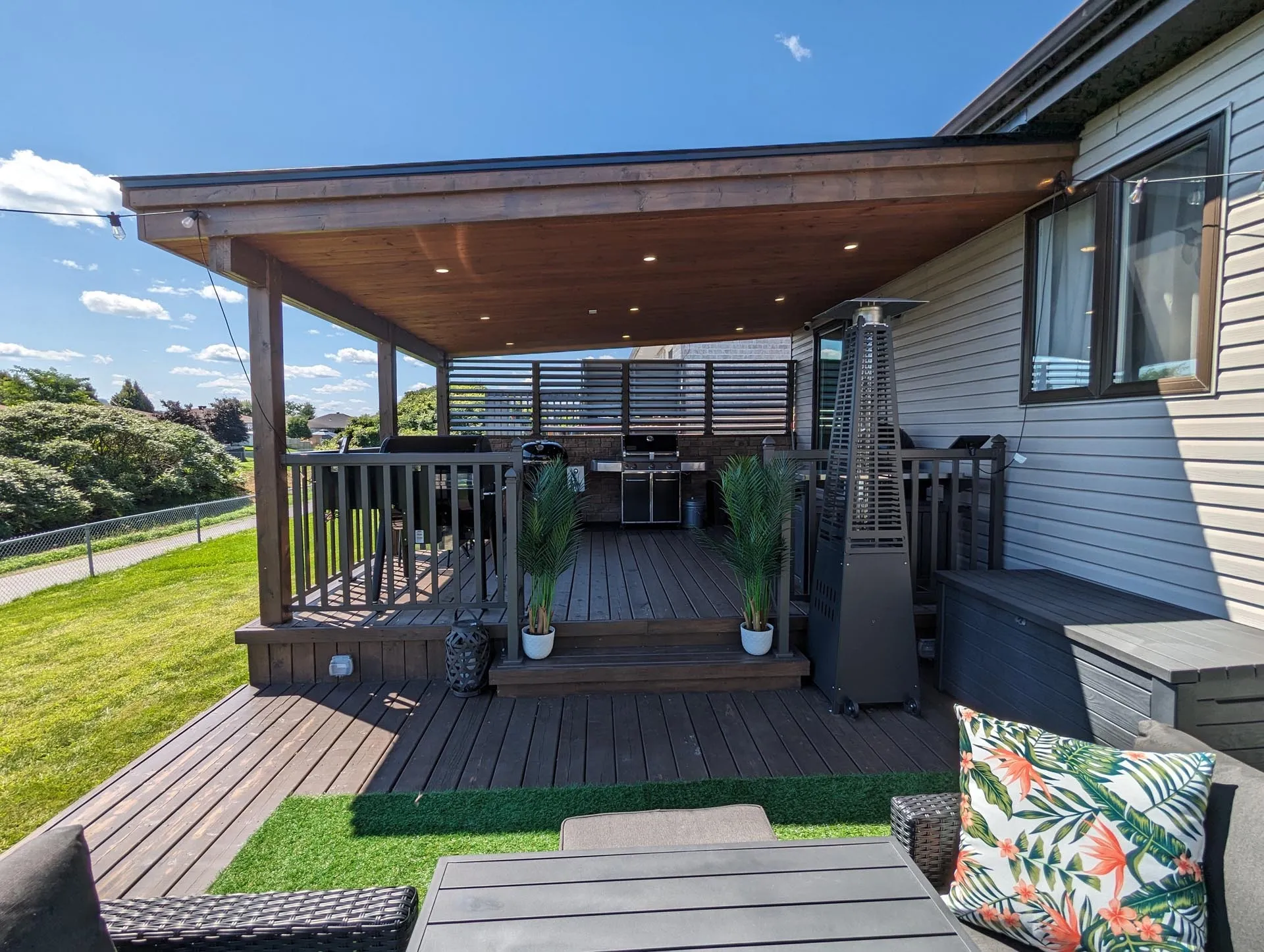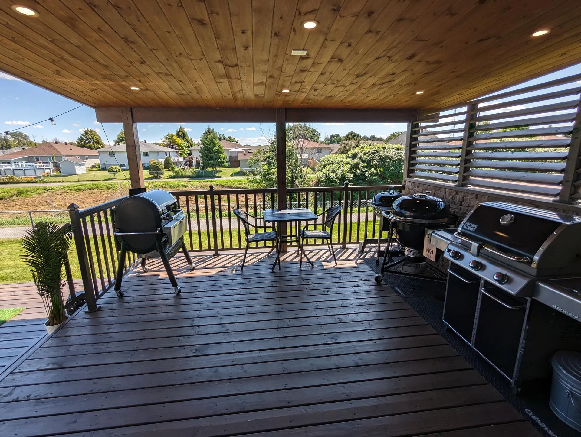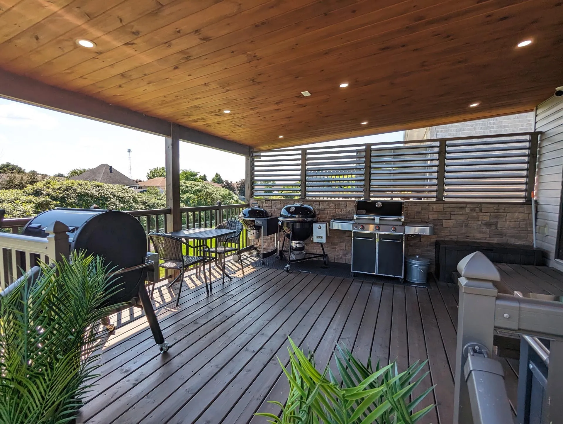 This deck features an upper-level covered deck area complete with a solid standing seam metal roof, tongue and groove pine ceiling with pot lights, a custom stone privacy wall with operable louvres, and beautiful aluminum railings. The lower level deck features a large surface area and wrap-around stairs.